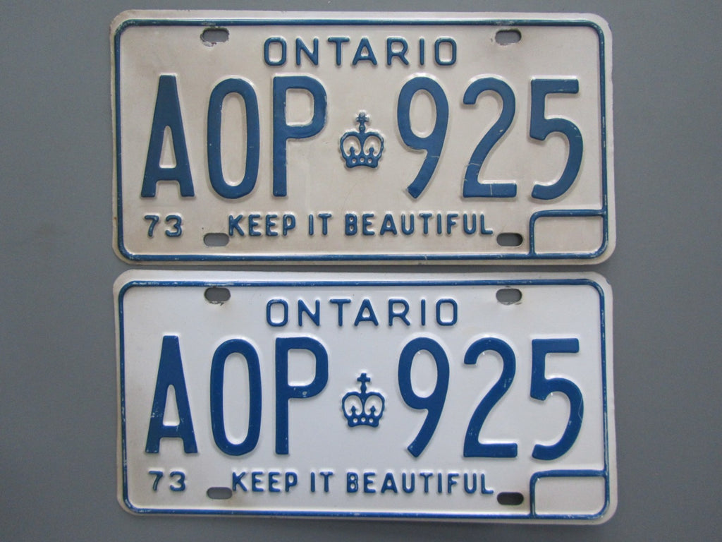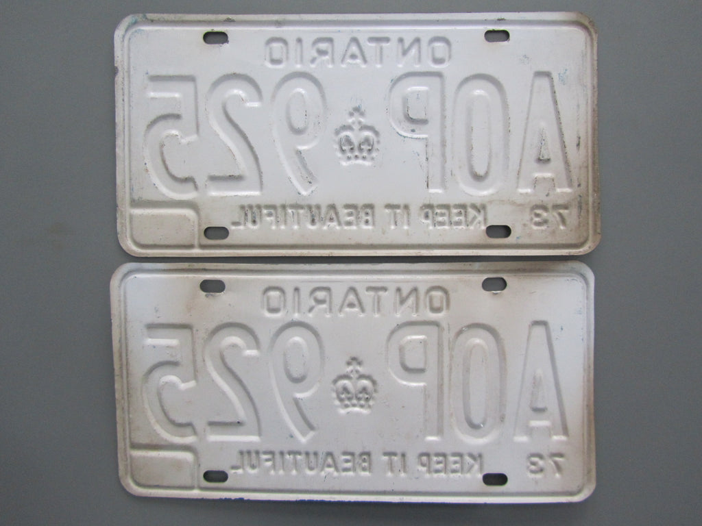 Original condition pair except the top plate and some of the lower plate white background has faded to beige. Still a good condition pair otherwise, but more suited for a survivor vehicle. Priced accordingly. Guaranteed MTO approval!